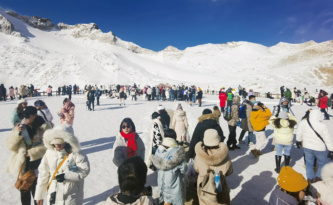 新年第二天,達古冰川持續火爆,游人如織,迎來游客高峰。壯觀而又圣潔的場景受到了各方游客的一致好評,山頂上是壯闊的雪景云海,山下是優美寧靜的自然風光,讓期待純潔和美好的游客們收獲了一場心靈之旅,達古不出意外的成為了元旦期間最受歡迎的旅游目的地之一!
