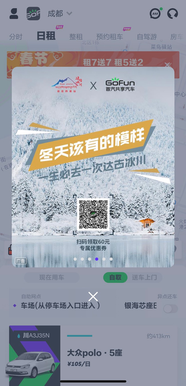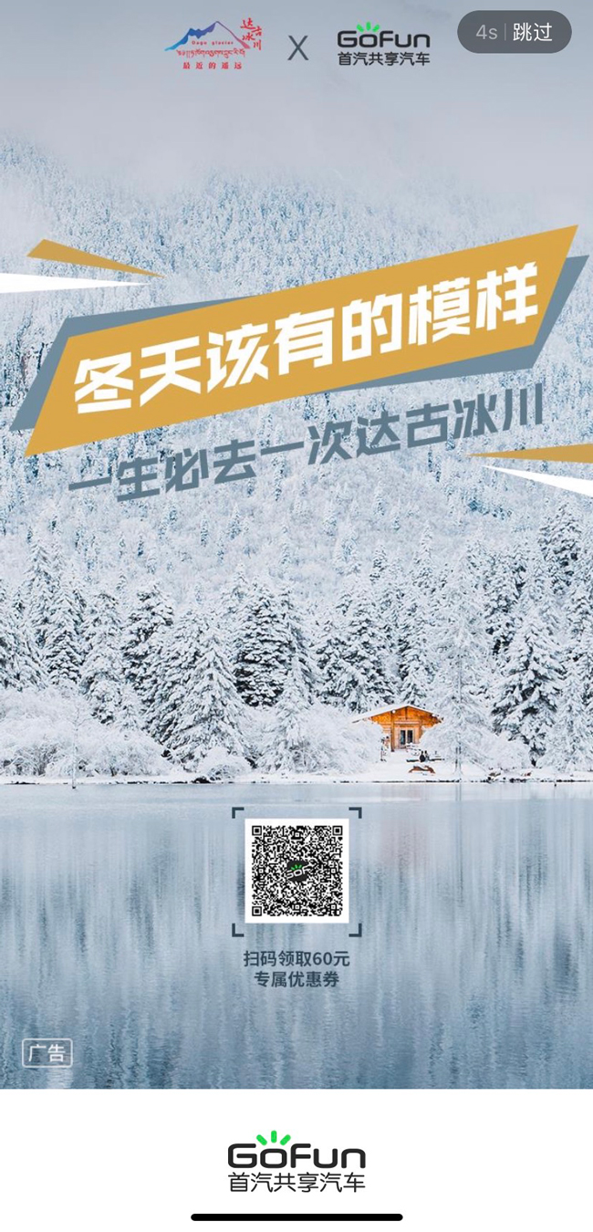 本次活動,使用go fun App租賃共享汽車前往達古冰川,在go fun 100個站點以及1000輛共享汽車車身的主題活動海報上,掃描活動二維碼即可得到專屬達古冰川的汽車使用優惠券。同時,針對月租用戶達古冰川還準備了100份門票好禮誠邀邀客前往旅行。達古冰川景區,“借助共享汽車行業,希望更多人發現生活的美好。到達古冰川來看看,生活依然值得努力而上”。