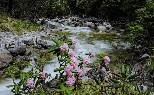 山下,高聳挺拔的樹木層層疊疊、遮天蔽日;藍綠色的湖泊,清幽靜謐;河谷兩旁的高山杜鵑,熱情綻放……森林、湖泊、杜鵑花和遠處的雪山冰川,組成了一幅壯麗畫卷,還有時常下山嬉鬧的藏酋猴,更是給景區增添了一份靈動與活力。