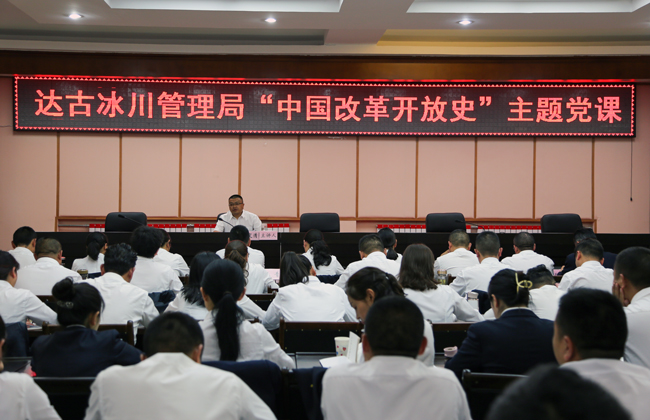 2021年6月27日下午,達(dá)古冰川管理局舉行了“中國(guó)改革開(kāi)放史”主題黨課。管理局局長(zhǎng)文定清同志圍繞“從百年黨史中汲取養(yǎng)分和力量,全面譜寫(xiě)達(dá)古冰川高質(zhì)量發(fā)展新篇章”這一主題,向全局黨員干部上了一堂精彩的黨課。