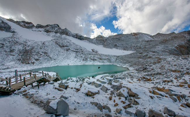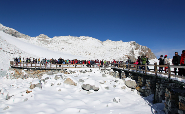 中秋小長假期間,達古冰川接二連三的下雪,讓景區(qū)都被白雪全部覆蓋了起來。