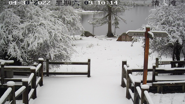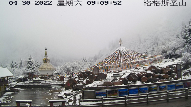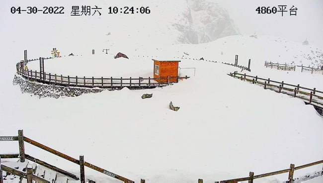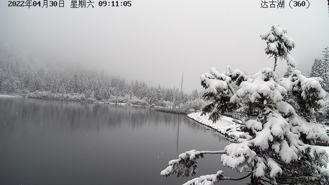 今日(4月30日)一大早,達古冰川迎來了漫天飛雪,山川樹木都披上銀裝,美不勝收。