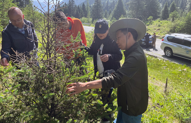 由于今年不穩(wěn)定氣候因素的綜合影響,達古冰川景區(qū)公路沿線植物病蟲害嚴(yán)重,按照管理局黨委工作安排,保護處扎實開展森林病蟲害風(fēng)險隱患排查化解工作。由于我局植物檢疫技術(shù)力量薄弱,無檢疫設(shè)備,無法確診病蟲害,為盡快查明病蟲害,貫徹落實“預(yù)防為主、科學(xué)防控、依法治理、促進健康”的森林病蟲害防治工作方針,保障景區(qū)森林資源和生態(tài)安全,遏制植物病蟲害傳播,我局于7月9日邀請四川農(nóng)業(yè)大學(xué)植物病害教授韓珊、蟲害博士楊遠亮、省林業(yè)和草原局有害生物防治檢疫總站測報辦主任劉子雄一行前往景區(qū)現(xiàn)場勘察和鑒定。