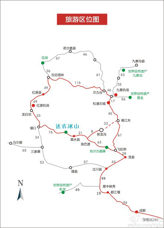 桃坪羌寨(理縣)——九頂山(茂縣)——古城(松潘)——花湖(若爾蓋)——黃河第一灣(唐克)——月亮灣(紅原)——達古冰山(微博、微信)(黑水)/米亞羅、畢棚溝(理縣)——汶川——成都。