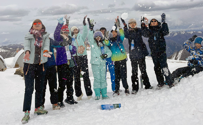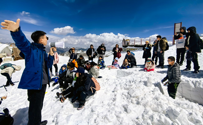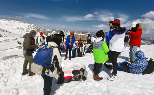 在4860山頂,他們在老師的帶領下,了解了空氣自動站的構造、工作原理。認識了鯨背巖、角峰、刃脊、坡面冰川、冰斗冰川、冰蝕湖等冰川地貌和古冰川遺跡。學員們相互,合作完成了堆雪人、雪坑采樣、雪冰密度測量、冰川保護等研學實驗。掌握了氣溫變化、冰雪成理、冰川蓋被子原理等科學知識。
