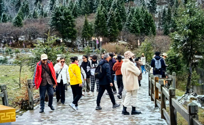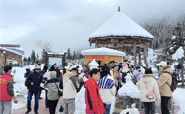 同時,低山區綠意繁盛,草木郁郁青青,湖泊澄澈碧綠,與高山區的皓然一色截然不同、對比鮮明。兩者相映成趣,形成了強烈的視覺沖擊力。游客們在雪中盡情撒野,玩得不亦樂乎。來自上海的游客王女士激動地說:“在同一時間,同一個地點,可以感受兩個季節美麗的景色,特別的開心。”