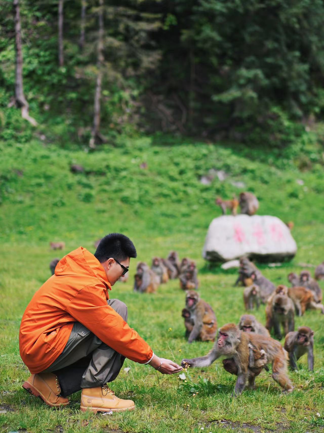 達古冰川“野生代言人”——藏酋猴也在等待與你相遇,憨態(tài)可掬的萌猴機靈又乖巧,僅需一把玉米粒就能享受人與動物和諧共處的愜意時光。