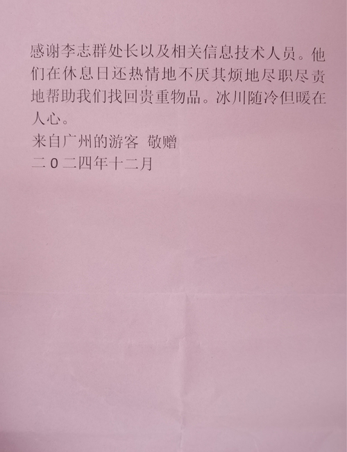 五位來自廣東的游客2024年12月23日到達古冰川景區游玩。在游玩過程中,不慎遺失了自己心愛的相機,相機中不僅有珍貴的照片,而且相機本身價值較高。游客心情十分焦急,立即向景區工作人員求助。工作人員得知這一情況后,迅速展開尋找行動。工作人員詳細詢問了相機丟失的時間、地點和大致特征。隨后,沿著游客可能經過的路線展開地毯式搜索,并調閱了相關區域的監控錄像。通過不懈努力,成功找回了游客遺失的物品,并第一時間送還到游客手中。經確認,相機完好無損,里面的照片也未丟失。
