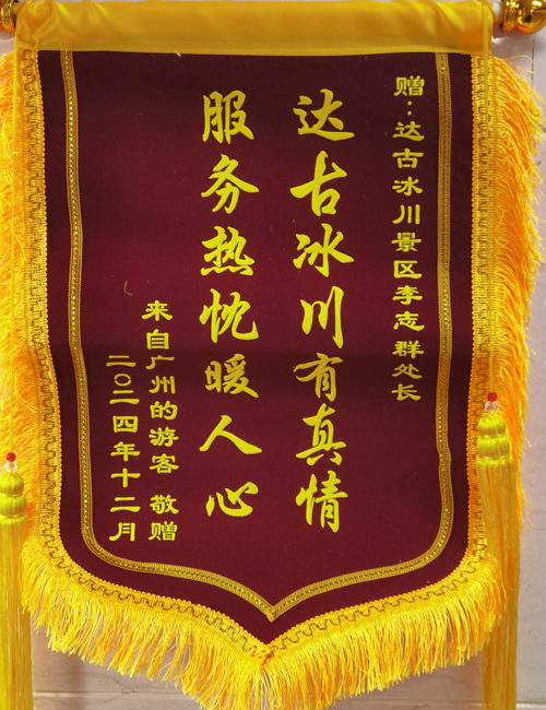 游客對景區的服務贊不絕口,表示這次旅行給他們留下了深刻而美好的印象。他們感慨道:“在達古冰川景區,我們不僅領略到了美麗的自然風光,更感受到了人性的溫暖和關懷。這里的服務人員就像家人一樣,讓我們有家的感覺,冰川雖冷但暖在人心”。為了表達他們的感激之情,游客特意制作了這面錦旗,并以快遞方式從廣州送到了達古冰川管理局。