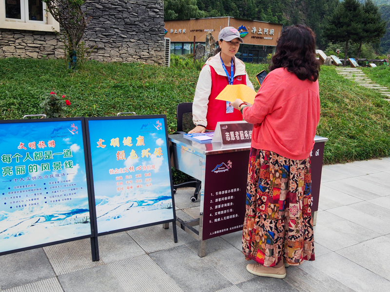 一是強(qiáng)化宣傳引導(dǎo),營(yíng)造文明游覽濃厚氛圍。聚焦立體化、精準(zhǔn)化、線上線下一體化宣傳,實(shí)現(xiàn)文明理念全域覆蓋、入心入行。更換售檢票口文明旅游提示牌4個(gè)、發(fā)放《文明旅游倡議書》600份,每天8小時(shí)滾動(dòng)播放文明旅游宣傳視頻;售票環(huán)節(jié)同步發(fā)放《達(dá)古冰川文明旅游公約》2000份,附帶率超70%;依據(jù)景區(qū)訂票平臺(tái)推送文明旅游提示,構(gòu)建“指尖上的文明課堂”。
