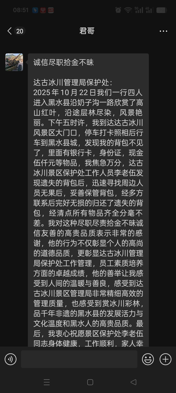 此次快速尋包事件,不僅充分展現了達古冰川景區警民聯動的強大合力與高效執行力,更生動詮釋了景區“把游客當客人、當親人、當貴人”的服務初心,為游客的旅途增添了一份堅實的溫暖與安心。