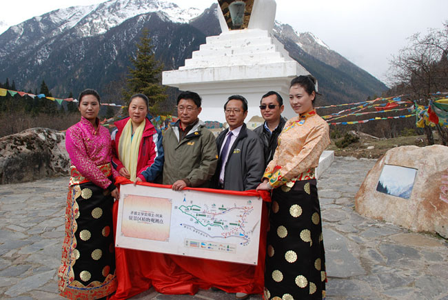 ? ? ? ? 達(dá)古冰山景區(qū)野生動(dòng)植物品類多、分布廣、野外可視率高,阿來主席曾多次到達(dá)古冰山景區(qū)拍攝植物,4月19日,在景區(qū)洛格斯朝圣之路路口,達(dá)古冰山景區(qū)和采風(fēng)團(tuán)一行共同舉行了“阿來——達(dá)古冰山植物考察點(diǎn)揭牌儀式”。隨后,采風(fēng)團(tuán)一行先后進(jìn)入遍布珍稀野生動(dòng)植物的羅比山谷(洛格斯朝圣之路)和海拔4860的冰山之巔進(jìn)行考察。