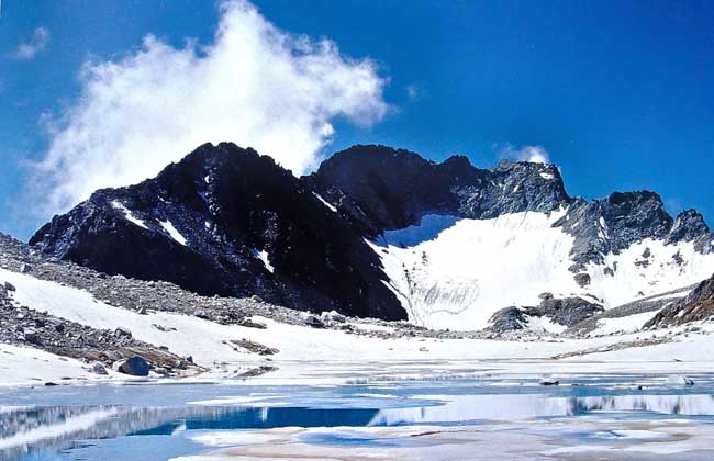 我已是第三次來這里,不急于和同行的人們馬上沖向外面的雪山。我為自己在雪山小屋中要了一杯香噴噴的熱咖啡,在寬大的觀景窗內落座。窗外的情景有些不可思議,甚至感覺有些奇異。海拔5200多米的達古雪峰覆蓋著厚厚的雪被,橫臥在眼前,仿佛一個未知的龐然大物。山體上是深雪,雪下,才是冰川。這道冰川每年只有7、8兩個月,積雪融化時才可以看見。但那冰川的力量卻隨時可以看見。下沖的冰川在雪峰下幾百米處刨出一個巨大的深坑,夏天和初秋,那是一湖碧水。湖水的上方,勁風獵獵,被陽光照耀,亮得晃眼的云團翻滾在天空,也翻涌在湖中。