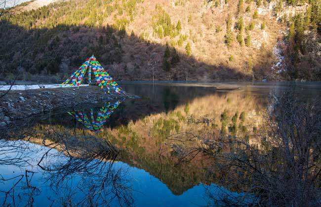 靜臥于峽谷中的澤娜措湖平靜如鏡,倒映著藍天白云、群山峻嶺。一群羽毛艷麗的鳥兒高唱著秋之歌,歡快地飛翔于湖天之間,精美的彩影在湖面上描摹出一幅神奇的圖案。一山一樹,一景一物,交相輝映,構成天水一色,天地一體。