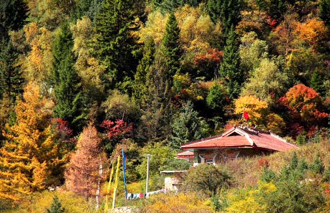 ——峰巒疊嶂、群山延綿、溝壑縱橫、林木森森。從山腳綿延于山腰的油綠松樹、墨綠杉樹、淺綠柏樹、火紅楓樹,一棵緊挨一棵,山樹相連,深紅淺黃層層疊疊。林海泛著既紅又黃也橙的金光,似乎是金燦燦的黃,又好似是黃燦燦的金;似乎是紅彤彤的橙,又好似黃澄澄的金。光影流動,變幻莫測。站在冰山頂上俯瞰,彩林猶如一件敞開的錦衣,掩映著俊逸的藏寨和鎏金般的田地;又如一雙拋開的錦袖,輕攬著“娜姆措”和“澤娜措”;也像一位盛裝的美人,陪伴著千年的達古河。這富有靈動的絕美畫卷,神秘而詭譎,令人窒息、迷醉!