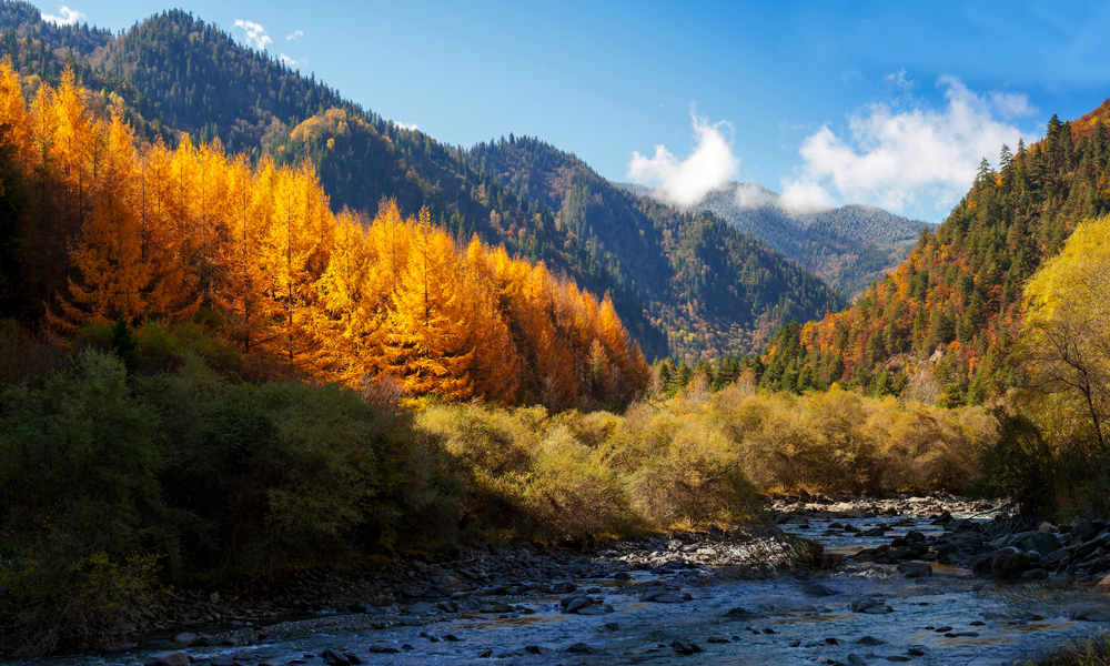 “奶子溝”在藏語中是美麗富饒、幸福安寧之意。當(dāng)?shù)氐牟刈逋诹奶熘懈嬖V我,如果站在高處向下看,奶子溝很象女人雙乳之間迷人性感的乳溝。奶子溝是溫暖的,親和的,可欣賞的,可感受的。奶子溝大峽谷兩側(cè)山林主要由樺樹、松樹、柏樹、楓樹和各種喬木組成,還有不同色彩的針葉林、闊葉林、次生林、灌木叢點(diǎn)綴其間,密密麻麻地覆蓋了一山又一山。在純凈的藍(lán)天下,在變幻的光景中,在淙淙的流水中,在清脆的鳥鳴中,“萬類霜天競自由”。紫紅、粉紅、橘紅、金紅、深黃、草綠、黃綠、棕紅、褐色的樹葉,多姿多彩、層次分明;他們像抱團(tuán)似的,和諧共生,互相映襯,誰也不擠兌誰。