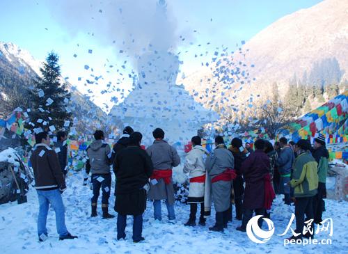 為了讓眾多游客參與體驗(yàn)黑水藏民族獨(dú)特的民俗文化,2015年1月1日,四川阿壩州達(dá)古冰山景區(qū)在洛格斯圣山舉行盛大新年祈福活動(dòng)。