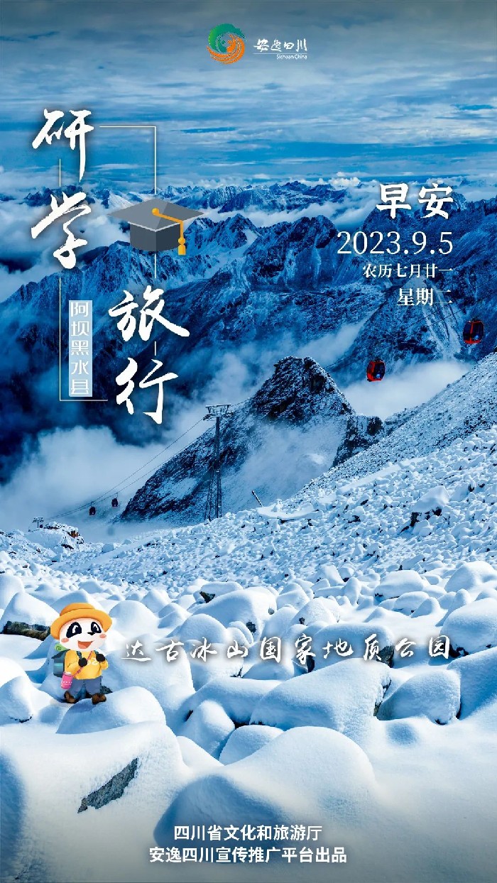 今日安逸四川日歷海報研學旅行走進阿壩黑水縣達古冰川國家地質公園,探索豐富多樣的冰川地質遺跡景觀。