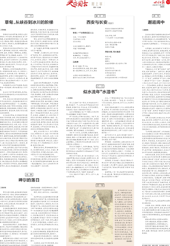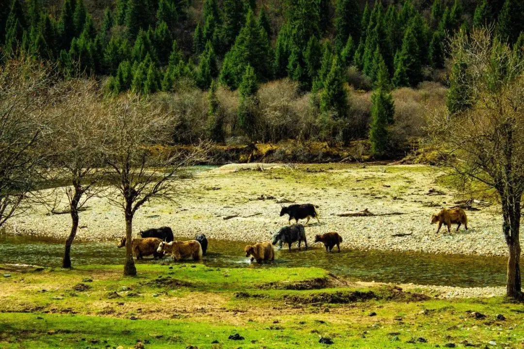 達古冰川的草甸,在不同的季節會展現出不同的風貌。金秋,草甸沒有春風里萬物復蘇的欣欣向榮,也沒有夏雨里蓬蓬勃勃的燦爛生機,它正在醞釀白雪覆壓前沉睡期的靜謐力度。此刻,正是一個重大的過渡時段,視野里,由遠及近,草甸勻稱地染上金黃的色彩。秋意漸濃,韻味兼具春夏的動感和嚴冬的安寧。牛羊悠閑地咀嚼時光,偶爾抬頭觀望那些觀望它們的攀登者。每棵草的露珠,都是精靈般的眼睛,把紅塵拋在身后。灌木叢里,那些紅果點點粒粒,吸吮了腐殖土養分的濃郁,成熟了,摘一粒放在唇邊齒間,一股酸爽,頓時,似乎就平復了路邊躁動鳥雀的啼叫。