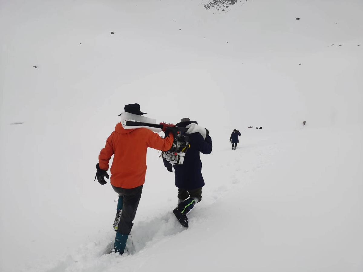到達實驗場地并非易事。海拔4680米的冰原之上,肩扛土工織布、背著觀測儀器的隊伍向著17號冰川緩慢前進。兩人一組抬著幾十斤重的材料,1公里的距離,要走兩個多小時。鞋子很容易陷進松軟的雪地里,然后很快濕透。走累的時候,一同前往的當地村民帶頭唱起黑水民歌《納里西莫》,用這首也曾在珠穆朗瑪峰唱響的民歌,互相加油打氣。