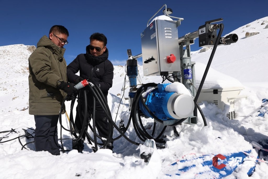 5年間,科研團隊持續探索冰川保護最佳方案。今年9月,一臺槍式造雪機在達古冰川淚湖邊進行設備測試實驗,探索通過人工造雪,將部分融化的冰水轉換成雪,增加冰川物質,減緩冰川消融。