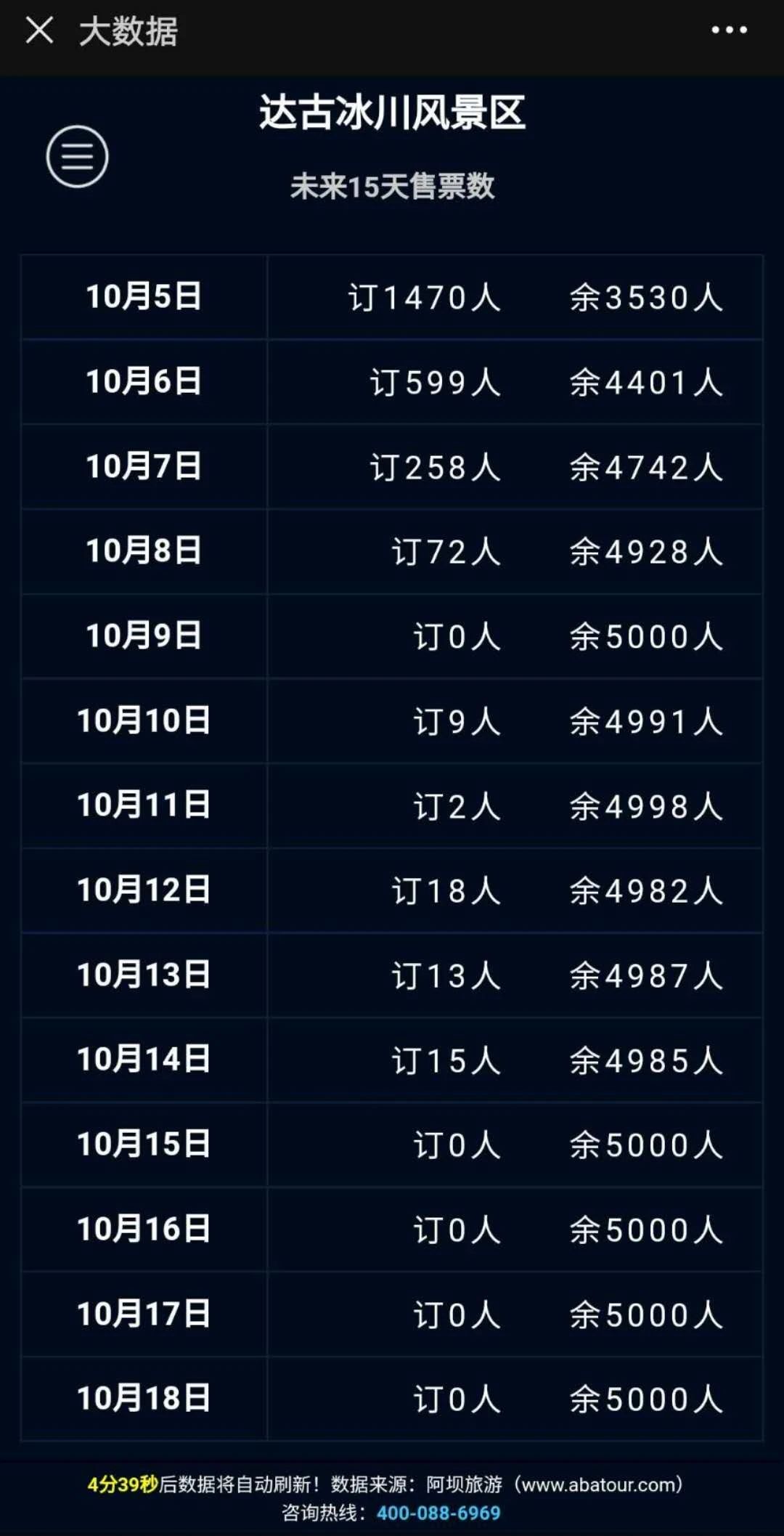 截止10月4日9:00,達古冰川景區游客人數已經達到日限量5000人次,,10月4日的門票已經售罄。大家可以先到周邊景區如奶子溝,卡龍溝,三奧雪山,色爾古藏寨游玩過后再到達古冰川。未來幾天達古冰川景區門票數量充足,想來達古冰川游玩的游客歡迎預訂未來幾天的門票。