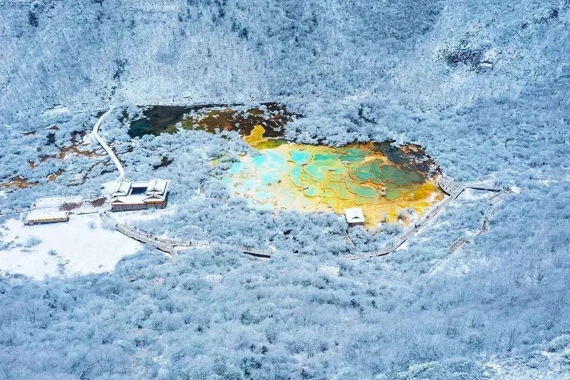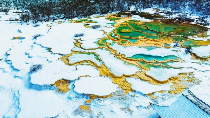 作為世界自然遺產(chǎn)地的黃龍,擁有世界上規(guī)模最大的鈣華彩池群,被譽為“人間瑤池”。由于主景區(qū)海拔超過3000米,冬季之時這里氣溫較低,常常大雪紛飛,但對于冰雪愛好者來說,是難得的冬日勝景。