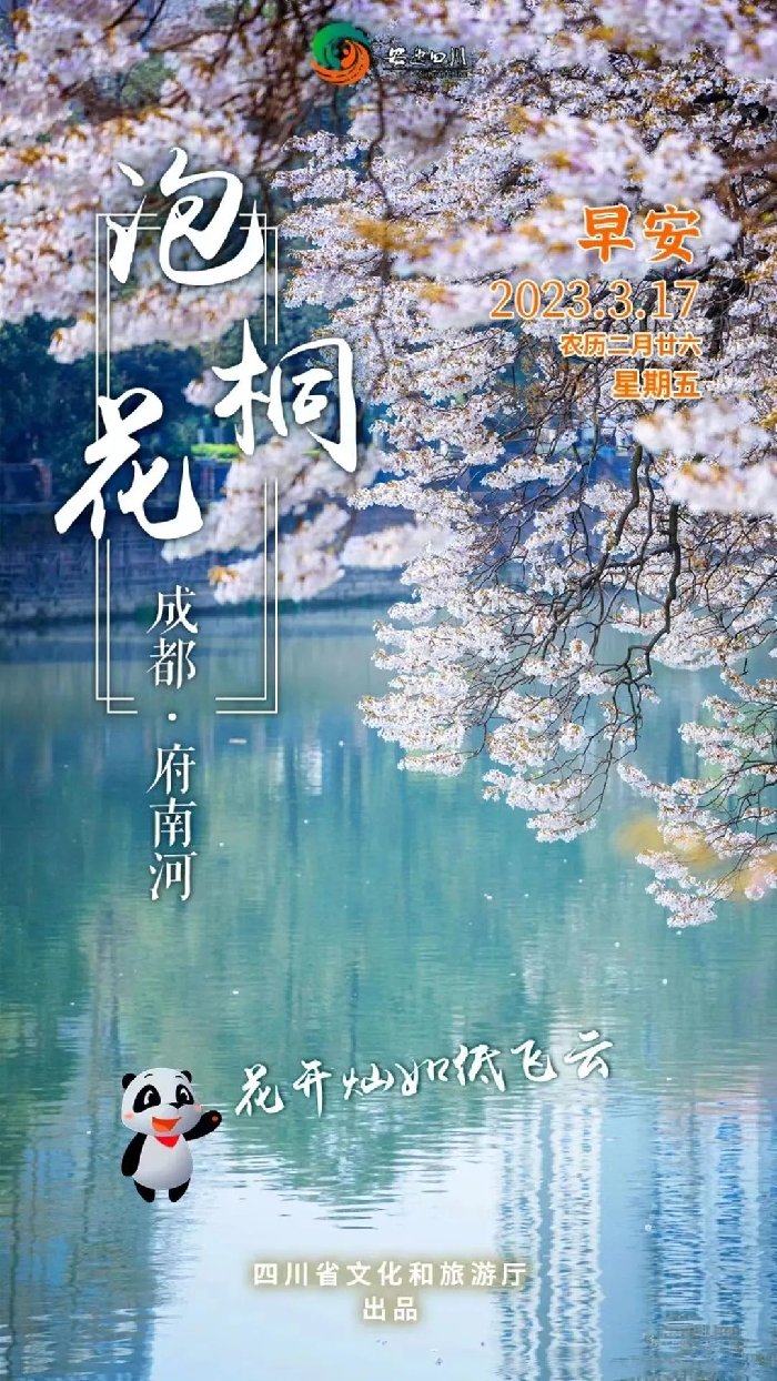安逸四川日歷海報|三月泡桐垂岸邊,燦如低飛云 打印 說明 日期:2023-03-17 16:11 作者: 四川文旅廳 點擊數:621 3月17日,星期五。 今天安逸四川日歷海報到大家漫游成都府南河邊,看三月泡桐花盛放如低云。 成都·府南河 三月的花兒開得正爛漫,大片大片的泡桐花,開成了霧,堆成了煙,空氣中也彌漫著蜜香。遠遠看去,錦江兩岸紫云燦爛,蔚為壯觀。 上一頁 下一頁