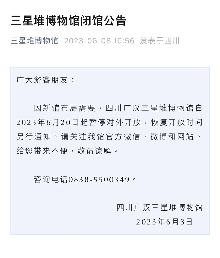 注意!三星堆博物館6月20日起暫停對外開放 打印 說明 日期:2023-06-09 09:16 作者: 川觀新聞 點擊數:1416 川新聞網-首屏新聞成都6月8日訊 6月8日上午,三星堆博物館微信公眾號發布閉館公告,因新館布展需求,四川廣漢三星堆博物館自2023年6月20日起暫停對外開放,恢復開放時間另行通知。 官方微信公眾號截圖 上一頁 下一頁