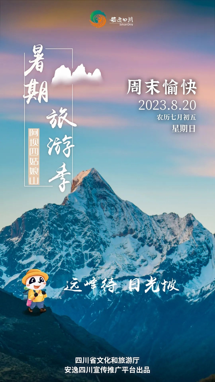 今天安逸四川日歷海報“暑期旅游季”走進阿壩州四姑娘山,感受遠峰靜待日光披的震撼美景。