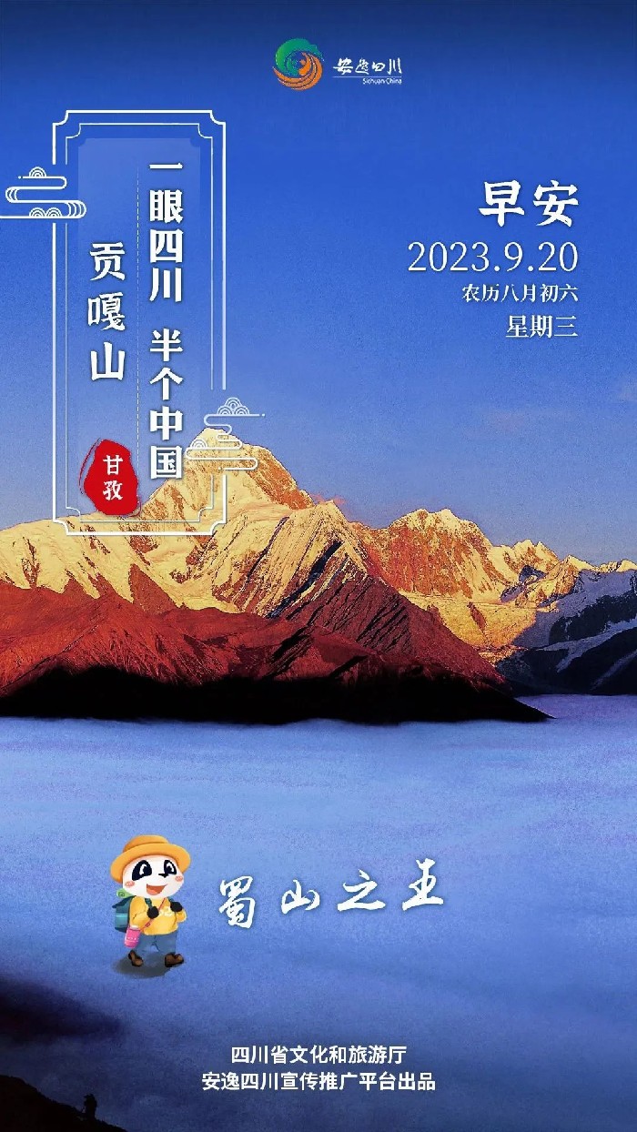 今日安逸四川日歷海報“一眼四川·半個中國”之旅走進“蜀山之王”貢嘎,感受四川最高峰的氣象萬千。