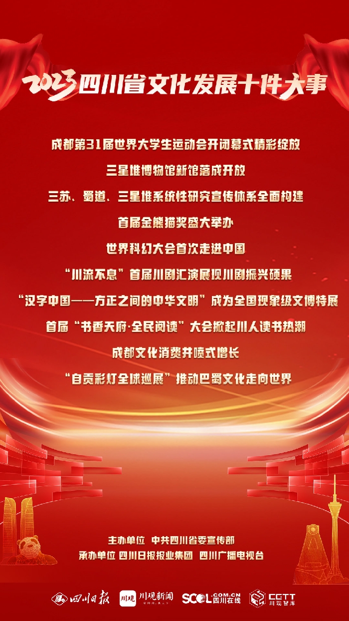 1月2日,由中共四川省委宣傳部主辦,四川日報報業集團、四川廣播電視臺聯合承辦的2023四川省文化發展十件大事評選活動發布儀式在成都舉行,經過網絡票選和專家評審,2023四川省文化發展十件大事正式發布,來看看哪些文化發展大事最終入選。
