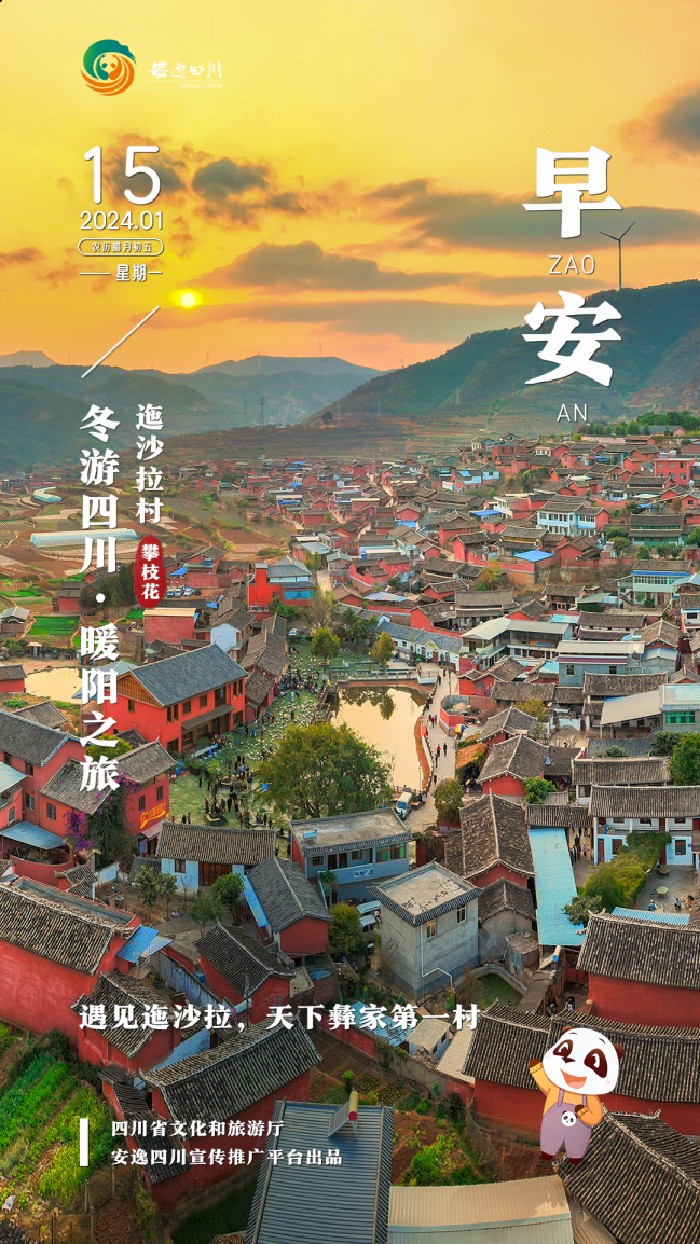 1月15日,星期一。今日安逸四川日歷海報“冬游四川”之旅走進攀枝花迤沙拉村,邂逅“天下彝家第一村”。
