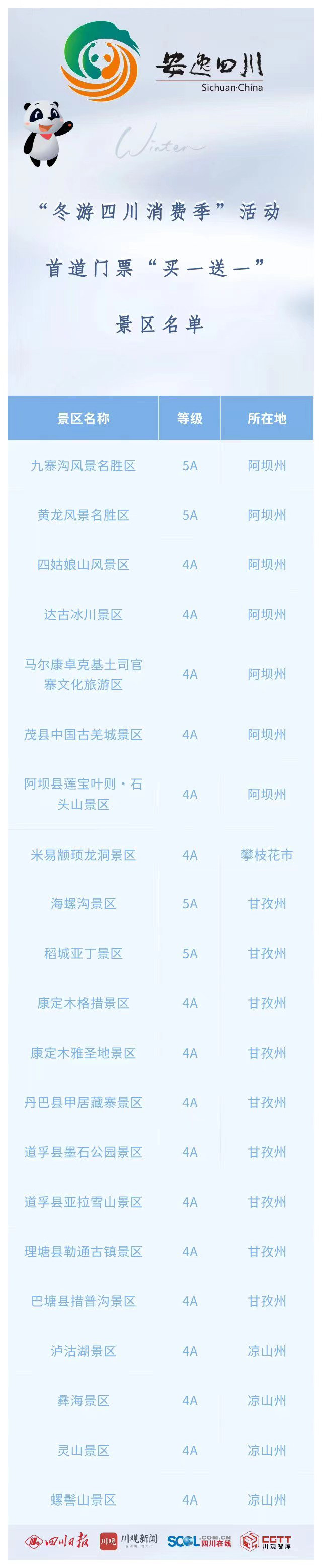 去年12月底,“冬游四川消費(fèi)季”活動(dòng)開(kāi)啟,推出引客入川獎(jiǎng)補(bǔ)、冬季航班航線補(bǔ)貼、降低省外來(lái)川小型客車高速公路通行費(fèi)、優(yōu)化入境旅游服務(wù)等系列優(yōu)惠政策,尤其是圍繞冰雪、陽(yáng)光等特色資源重點(diǎn)區(qū)域,推出阿壩州、甘孜州、涼山州和攀枝花市“三州一市”國(guó)有4A級(jí)及以上旅游景區(qū)將實(shí)行“門票買一送一”、國(guó)有4A級(jí)以下旅游景區(qū)門票全免的優(yōu)惠政策,包括九寨溝、黃龍、稻城亞丁、四姑娘山、達(dá)古冰川等熱門旅游景區(qū)。