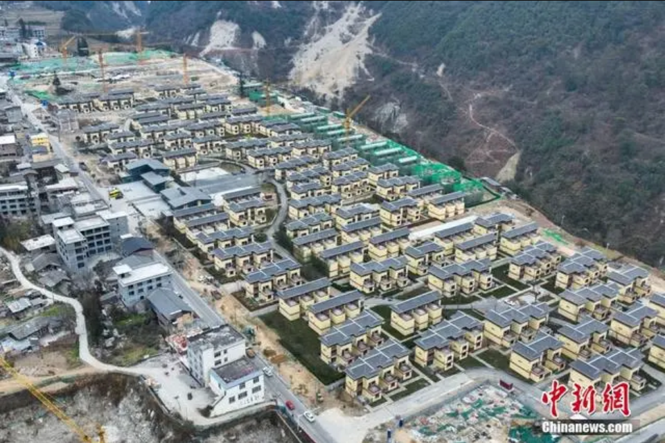圖為2月1日,瀘定磨西鎮震后重建的安置小區。(無人機照片)中新社記者 劉忠俊 攝