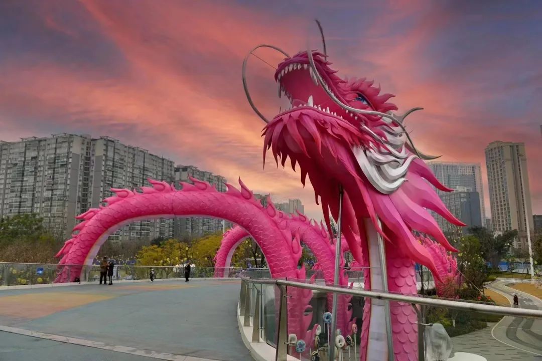 據(jù)主辦方相關(guān)負(fù)責(zé)人介紹,這條“紫氣東龍”的形象還原自《山海經(jīng)》中的描述,在龍的腹部結(jié)合了蜀錦經(jīng)典圖紋——桃花流水錦紋飾,寓意和睦美滿幸福的生活。到了夜間,整個(gè)龍身呈現(xiàn)出光影效果,與園區(qū)錦江塔及其他10組科幻光影藝術(shù)燈組相呼應(yīng),營(yíng)造出“龍”重的春節(jié)氛圍。