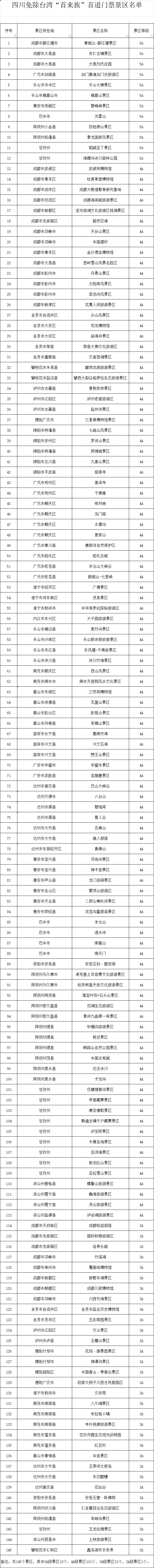此外,記者還從四川省旅游景區(qū)協(xié)會(huì)了解到,為讓臺(tái)胞更好感受大美四川,進(jìn)一步提升臺(tái)胞在川旅游體驗(yàn),四川還有31個(gè)3A級(jí)景區(qū)、1個(gè)2A級(jí)景區(qū),免除臺(tái)灣“首來(lái)族”門票。目前,四川面向臺(tái)灣“首來(lái)族”免除門票的景區(qū)已達(dá)145個(gè)。臺(tái)灣“首來(lái)族”游客可通過景區(qū)網(wǎng)站、入口標(biāo)識(shí)和相關(guān)旅行社等,及時(shí)了解景區(qū)有關(guān)減免門票費(fèi)用措施。