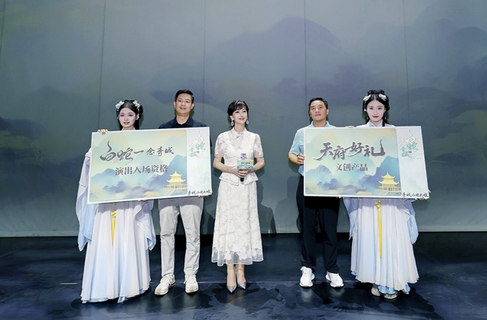 活動現場為趙雅芝頒發“青城山文旅推薦官”聘書。現場還設置福利贈送環節,趙雅芝與都投集團、青城山《白蛇一念青城》沉浸式演藝項目代表攜手,向游客贈送都江堰特色文創禮品、演藝門票等。