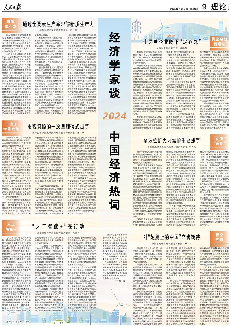 2024年,面對國內(nèi)外形勢帶來的挑戰(zhàn),以習近平同志為核心的黨中央團結(jié)帶領(lǐng)全黨全國各族人民,沉著應變、綜合施策,順利完成經(jīng)濟社會發(fā)展主要目標任務,高質(zhì)量發(fā)展扎實推進,中國式現(xiàn)代化邁出新的堅實步伐。這一成績來之不易,分量十足,很不平凡。盤點這一年的經(jīng)濟熱詞,許多高頻詞會跳進人們的腦海。它們既是我國發(fā)展的折射與寫照,也代表著未來發(fā)展方向。我們選擇部分熱詞,邀請專家學者談感受、話思考、聊未來,以饗讀者。