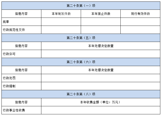 各行政機關(guān)年度報告格式模板附后。此前有關(guān)政府信息公開的各類報告和統(tǒng)計口徑,隨原政府信息公開條例的失效而失效。政府信息公開工作主管部門負責(zé)匯總的本級政府年度報告格式,參照這一格式模板辦理。黨的工作機關(guān)加掛行政機關(guān)牌子的單位,年度報告內(nèi)容依據(jù)全國政府信息公開工作主管部門發(fā)布的有關(guān)規(guī)定(國辦公開辦函〔2019〕51號)確定,并參照這一格式模板辦理。