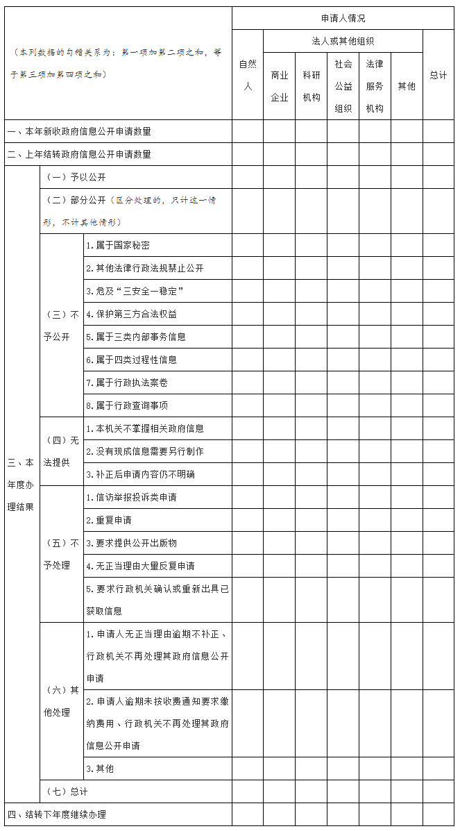 這一項主要報告兩方面情況:一是申請人的類別;二是政府信息公開申請的最終處理結(jié)果。此項內(nèi)容重在數(shù)據(jù)準(zhǔn)確、要素齊備,全面客觀反映政府信息公開申請接收和辦理情況,便于政府信息公開工作主管部門全面掌握工作動態(tài),使社會各界了解政府公開透明進程。