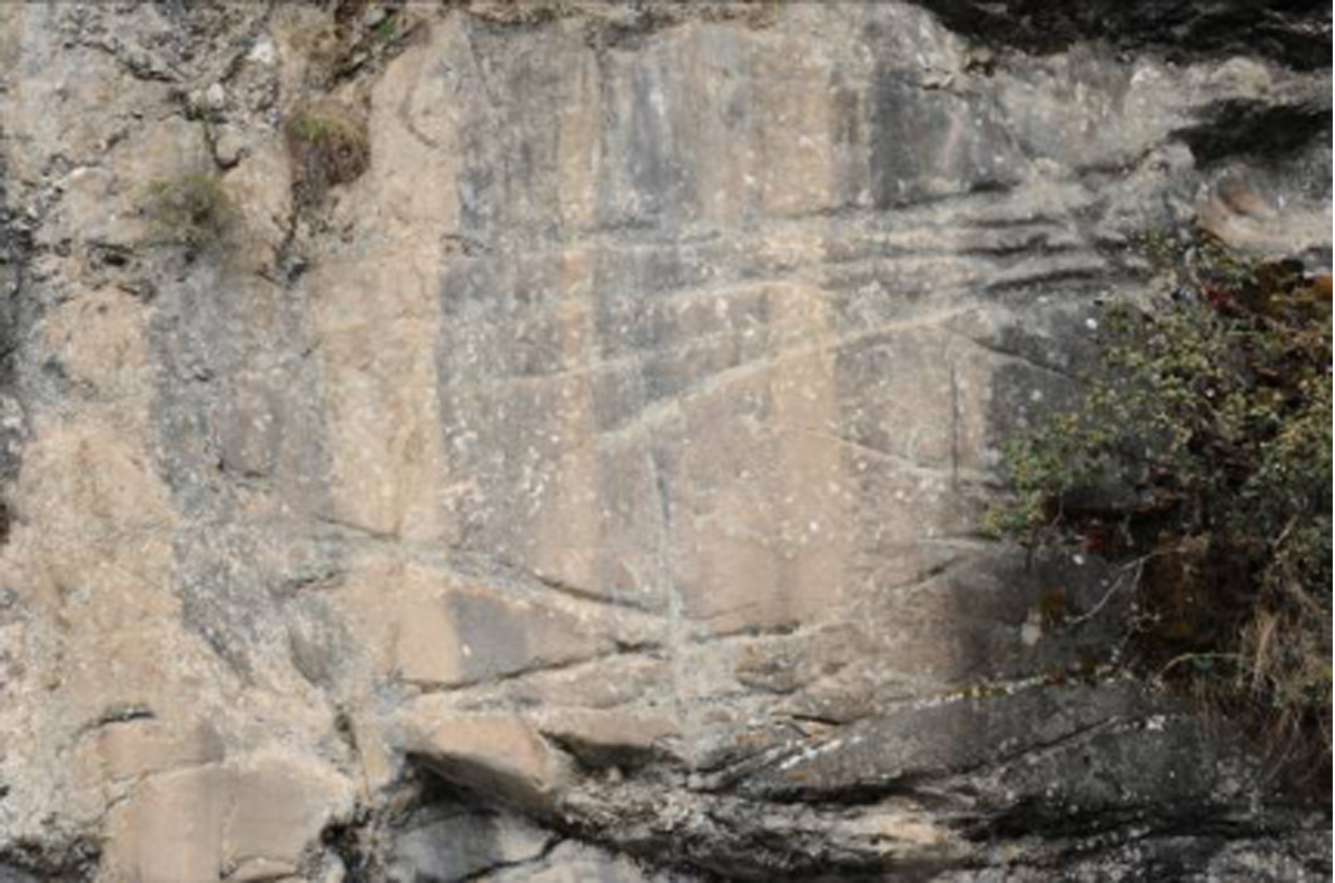 系巖漿巖脈侵入變質(zhì)(砂、頁(yè)巖)中,經(jīng)過(guò)構(gòu)造擠壓變形后形成,它保留著巖石形成時(shí)擠壓變形的層間褶曲,同時(shí)還烙上了冰川運(yùn)動(dòng)摩擦、擠壓的擦痕和塑性變形彎曲的烙印。