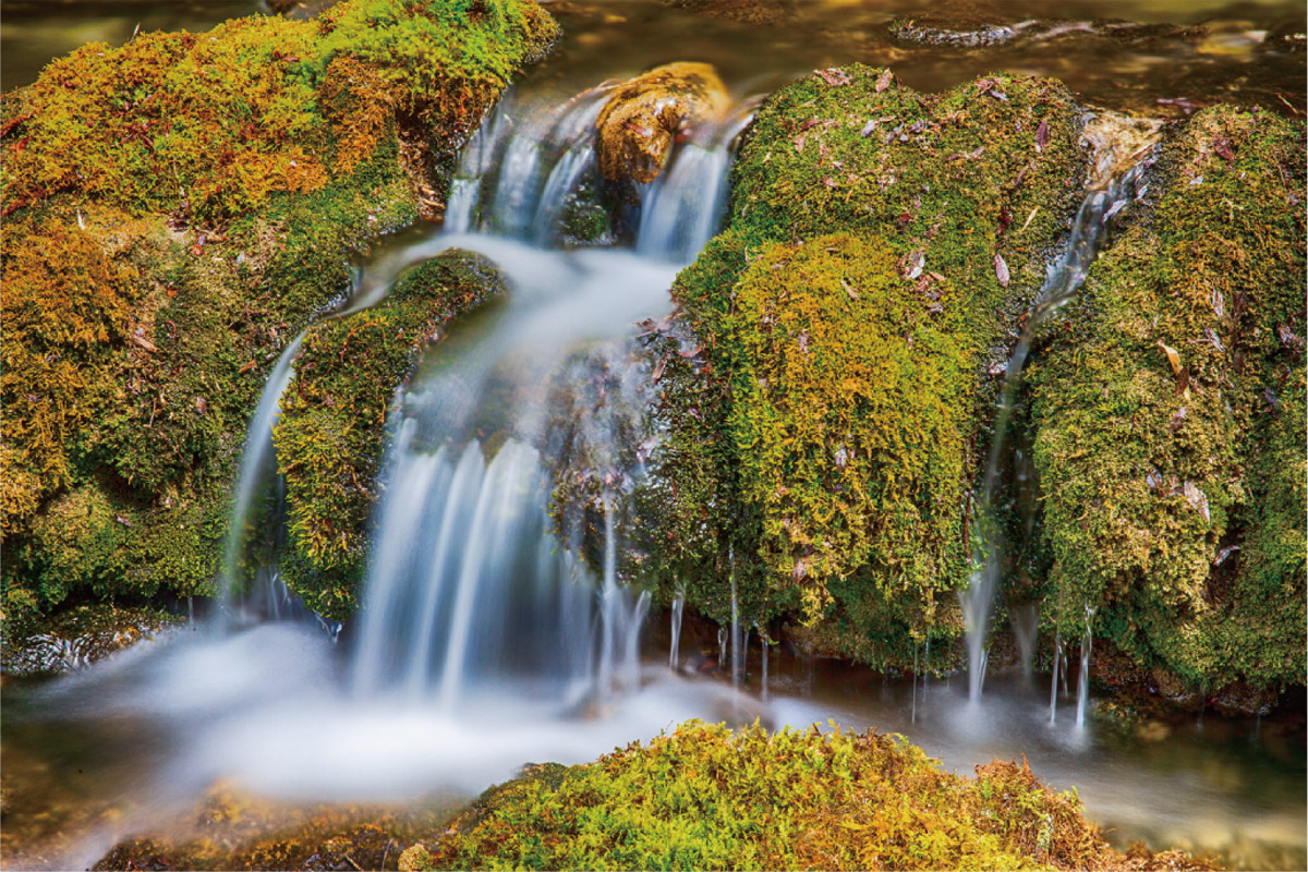 位于彩毯坡鈣華臺(tái)形成的跌水陡崖上,陡崖高約5 m、寬13 m,瀑布呈線狀;鈣華臺(tái)上翠綠色、黃綠色、鵝黃色的青苔叢生,猶如一條美麗的彩毯,水自頂端直瀉而下,似串串珍珠懸掛于彩毯之上。可謂是:清泉跌撞崖面,飛玉濺珠玉盤(pán)。