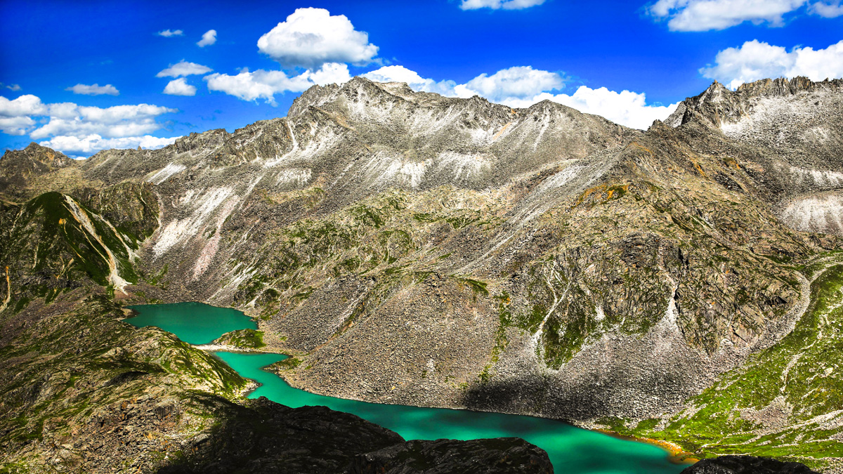 園區(qū)最大的冰川湖泊,由兩個(gè)呈北東向展布豆莢狀湖泊相連而成,坐在索道纜車(chē)中,俯瞰著如翠玉鑲嵌在山間的湖光山色,令人賞心悅目,流連忘返。
