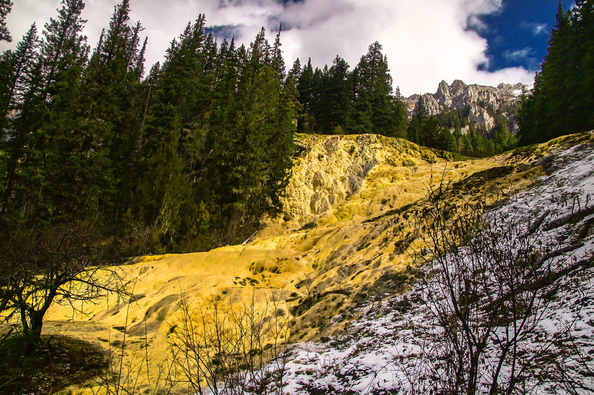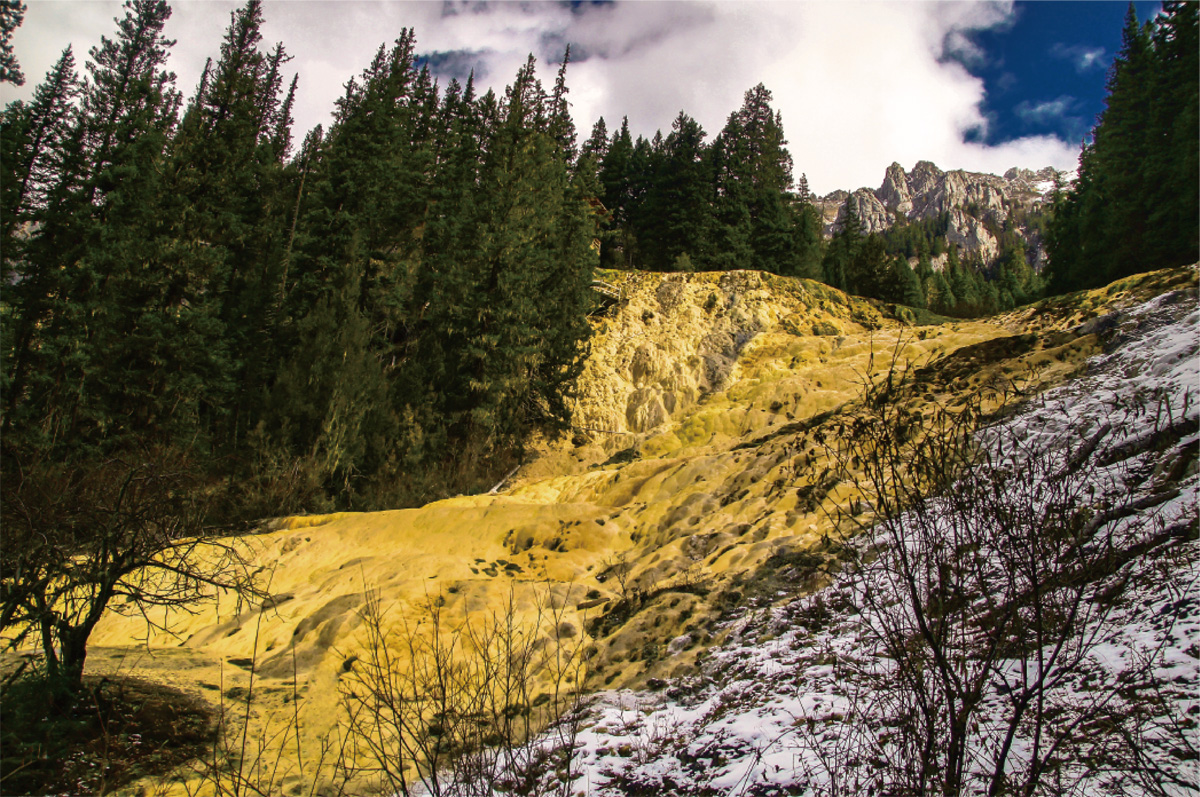 天然鈣華池群,呈臺(tái)階狀,似層層梯田。池水中生長(zhǎng)著綠藻、苔蘚、灌木和高山柳等植物,如一個(gè)不加修飾的巨型天然盆景,粗狂不失柔美。