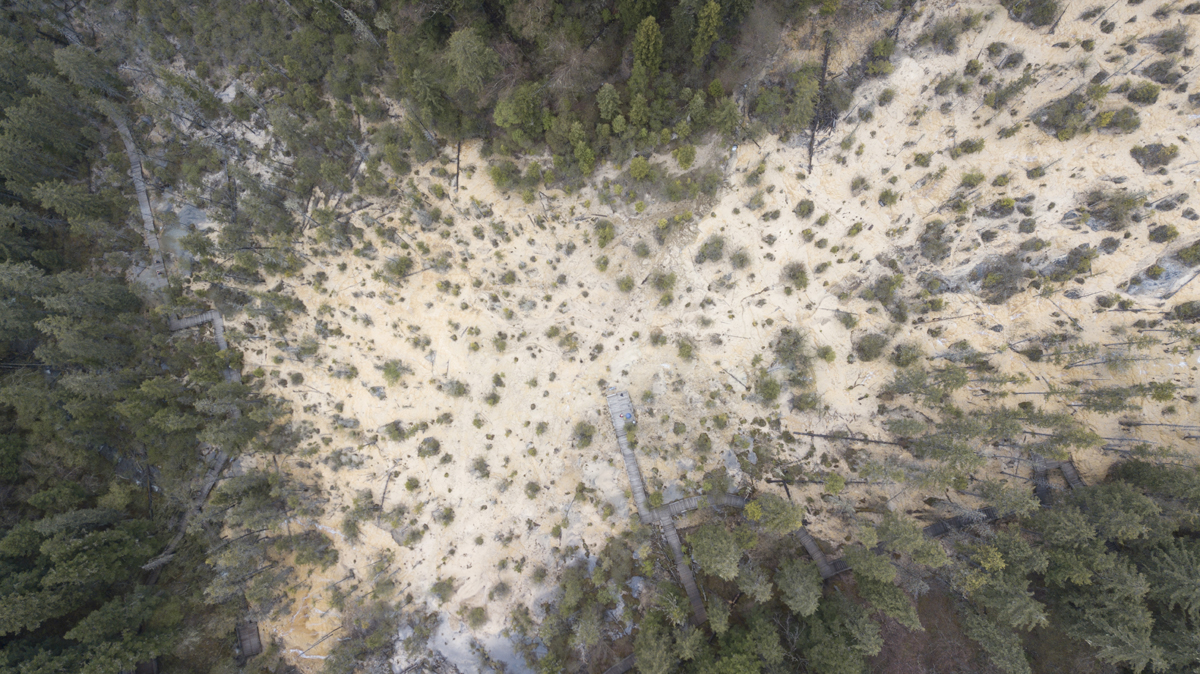 長(zhǎng)坡寬約44 m,長(zhǎng)53 m,下部臺(tái)地前緣寬約67 m,長(zhǎng)71 m,在陽(yáng)光的照射下,黃色鈣華沉積物如片片龍鱗,長(zhǎng)坡若隱藏在山林里的金色巨龍,氣勢(shì)恢宏。