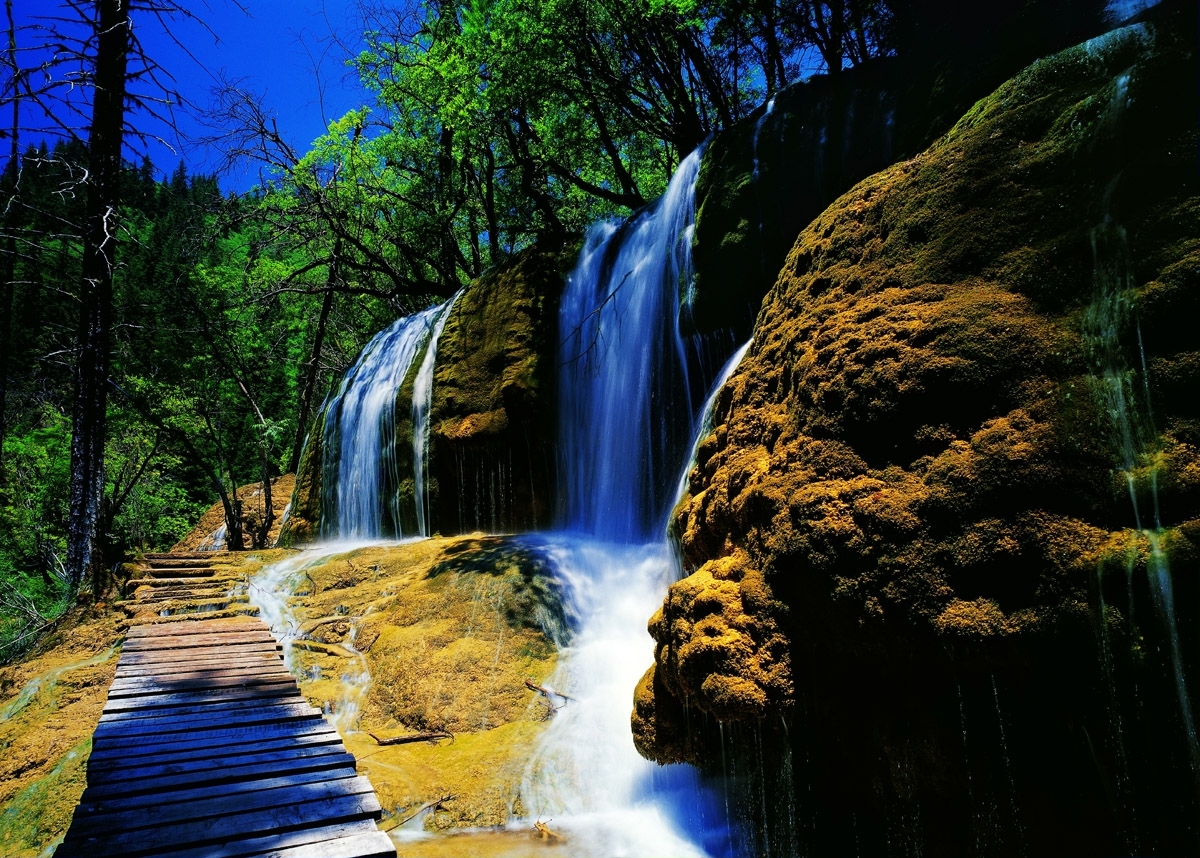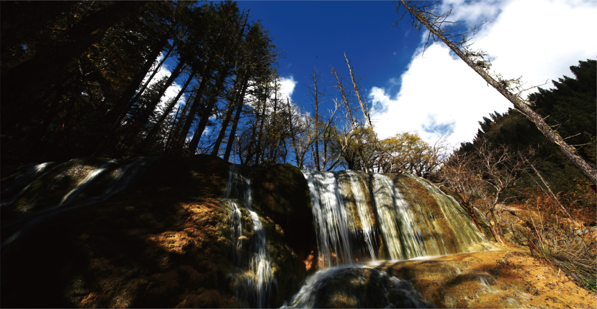 位于迎賓鈣華臺(tái)上,高60 m,寬近百米,是卡龍溝最大的瀑布。迎賓飛瀑水流或以面狀匯集,或以珠簾玉碎的線狀形態(tài)展布,仿佛用一條條迎賓哈達(dá),歡迎著來(lái)自四面八方的朋友。