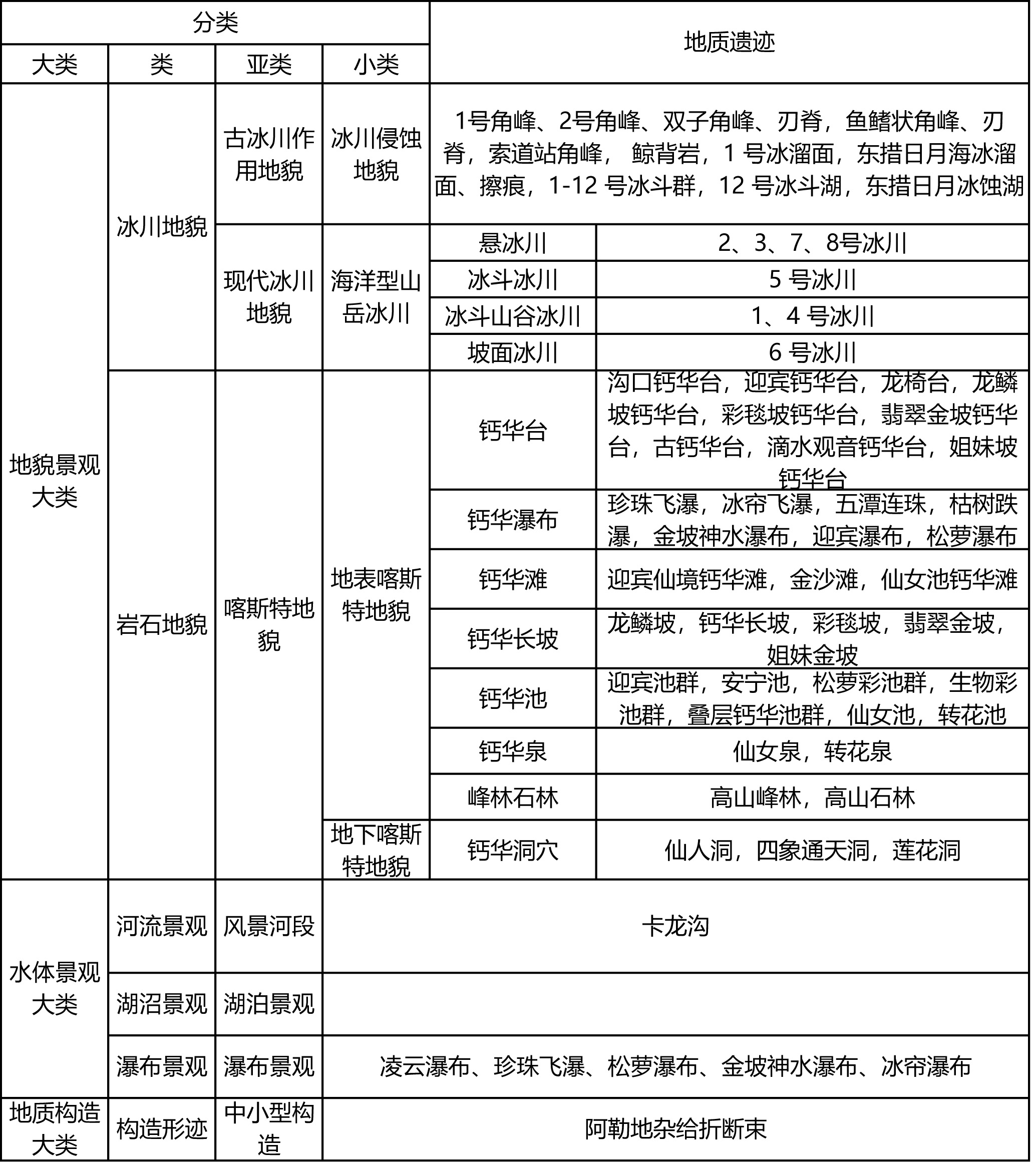 按照國土資源部2016年7 月《國家地質公園規劃編制技術要求》【國土資發[2016]83號】文件的相關標準,公園內的地質遺跡可分為3大類,8類和12個小類,其主要類型為地貌景觀,水體景觀、地質構造三大類,其中以現代冰川、古冰川遺跡地貌和高寒喀斯特地貌為主要特色。