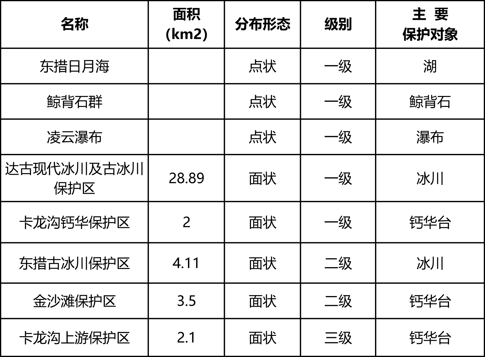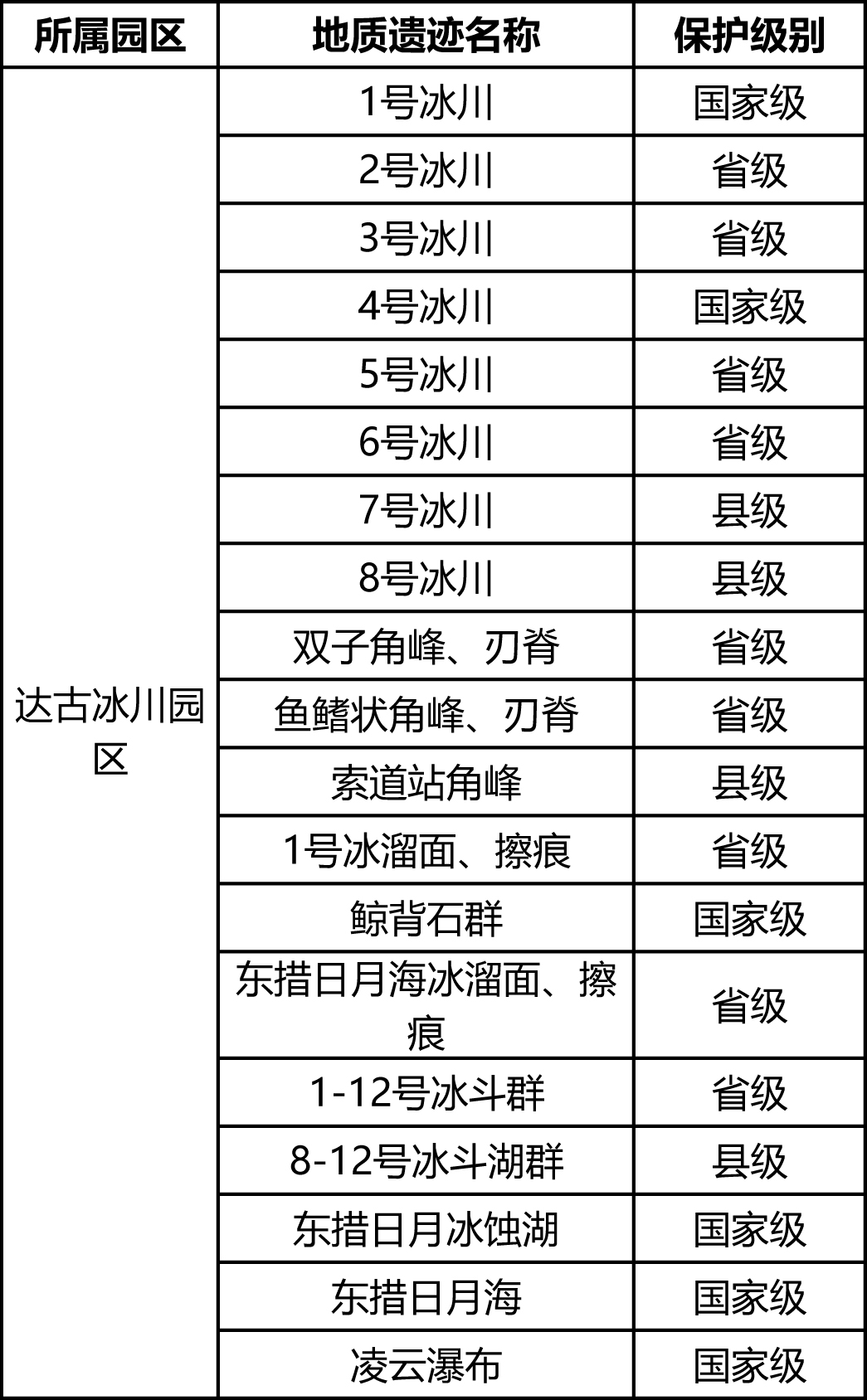四川達古冰山地質公園地質遺跡保護名錄表