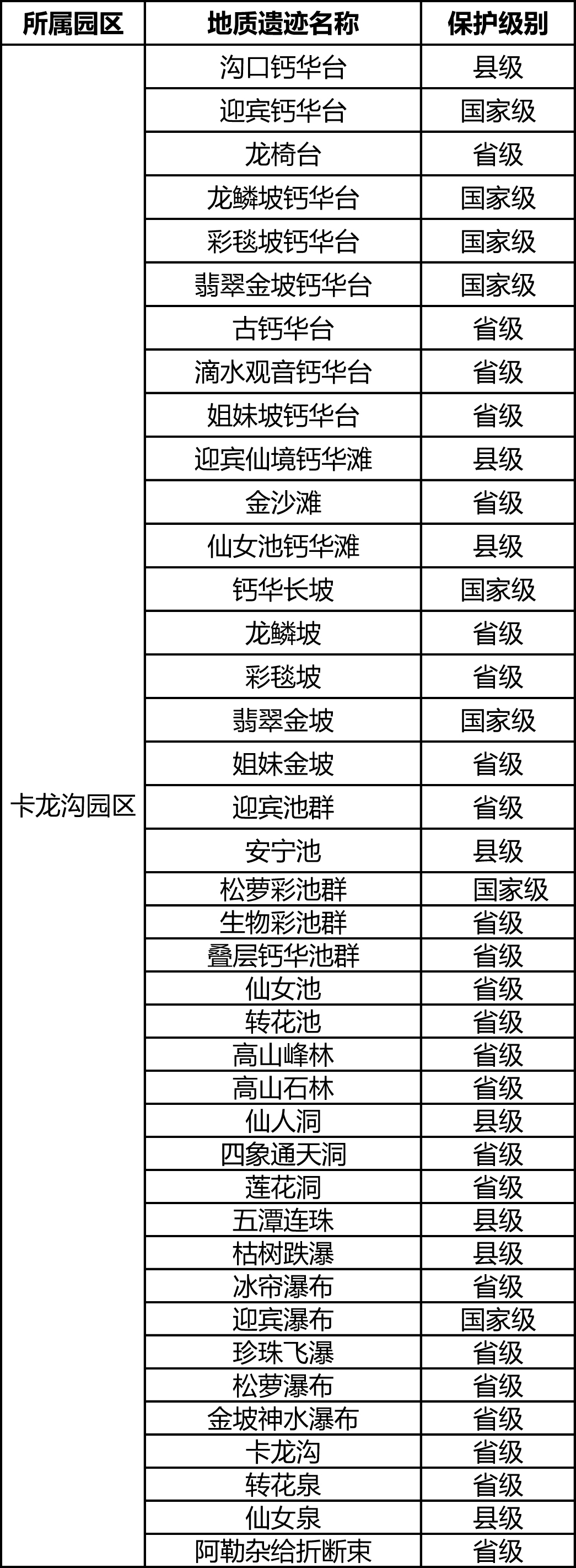 三級保護區:公園內三級保護區為卡龍溝上游地質遺跡保護區,面積2.1平方千米,三級保護區總面積2.1平方千米,占保護區面積約4.12%。